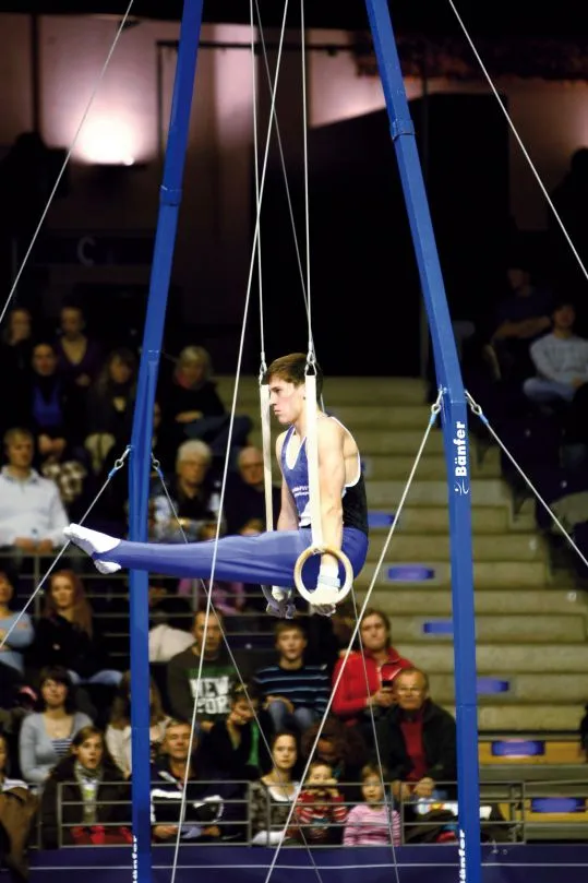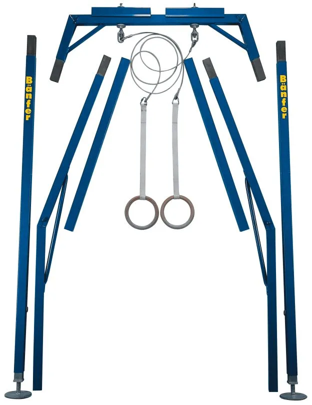 Das FIG zertifizierte Bänfer® Ringegerüst Exklusiv Microswing erfüllt alle Anforderungen für das Turnen an den Ringen. Die Doppelverspannung lässt sich mit speziellen Schnellspannern problemlos bedienen und vermindert Konterschwingungen. Das Microswingsystem reduziert die Belastungen auf den Turner.