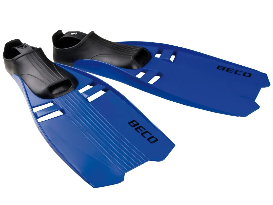 Qualitäts-Schwimmflosse aus Kunststoff, geschlossenes Fußteil mit Zehenfreiheit, neuentwickeltes großes Flossenblatt mit vier Strömungskanälen. Farben blau/grau und schwarz/grau sortiert. Lieferung paarweise.