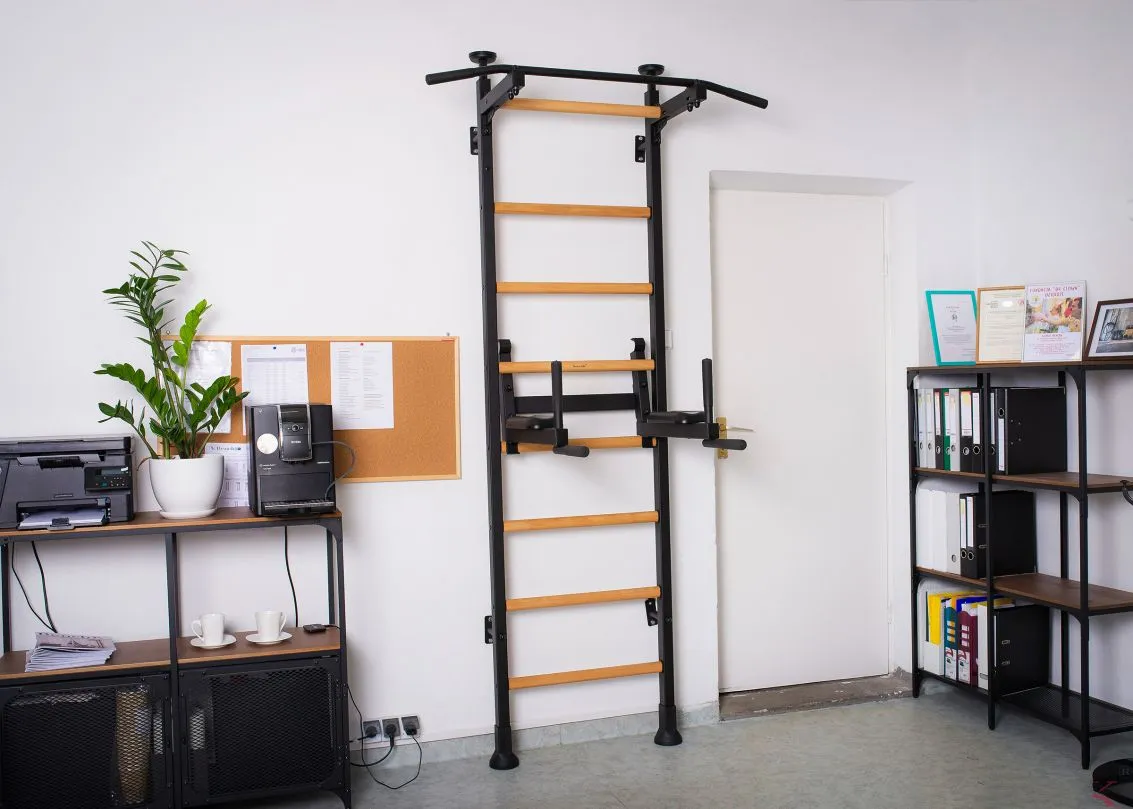 Hochwertige Sprossenwand in den Maßen 67 x 230 cm mit Metallprofilen und 8 ovalen Buchenholz-Sprossen (30 x 40 mm). Die Sprossenwand entspricht der Norm EN 913 und der Norm EN 12346 und kann entweder an die Wand montiert werden, oder alternativ an Boden- & Decke befestigt werden. Tolles Sportgerät und ideal auch für den Heimgebrauch. Fest angebrachte Klimmzugstange aus Metall und ein verstellbarer Dipbügel inkl. Armlehnen erweitert die Nutzungsmöglichkeiten der Sprossenwand.