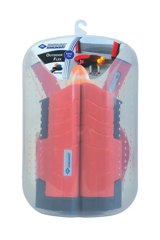 Das Outdoor Flex Set von Donic-Schildkröt beinhaltet 2 Stk. der neuen innovativen Outdoor-Schläger aus einem 2-Komponenten-Kunststoff. Ein harter verwindungssteifer Kern aus schwarzem Kunststoff plus ein zweiter aufgespritzter weicher, griffiger (gummiartiger) Kunststoff in Rot für Griffigkeit, sicheren Schlägerhalt, Spin, Beschleunigung etc. Diese neuartigen Schläger können problemlos mit jedem Freizeitschläger aus Holz mithalten! Gleichzeitig sind sie wasserfest (können also auch mal bei Regen im Garten vergessen werden), sie sind abwaschbar und somit hygienischer (ideal für öffentliche Einrichtungen wie Schulen, Jugendclubs, Pfarrheime etc.). Außerdem sind sie deutlich robuster, sie können runterfallen ohne dass ein Holz splittern kann. Ebenfalls im Set enthalten ist das Flex Netz aus dem Hause Donic-Schildkröt: ein absolut neuartiges und innovatives Tischtennis-Netz. Ein spezieller Auf- bzw. Ausrollmechanismus mit kräftiger Feder, integriert in die beiden Kunststoffpfosten, ermöglicht ein stufenloses Aufbauen dieses Netzes an praktisch jedem Tisch bis max. 175 cm Tischbreite. Hierbei kann das Netz eben nicht nur an jedem Tischtennistisch angebracht werden, sondern vor allem auch am Bürotisch, Küchentisch, Esstisch, Bistrotisch vielleicht sogar auf dem Schultisch – somit kann spontan und völlig flexibel immer und überall Tischtennis gespielt werden ohne die teure Anschaffung einer Tischtennis-Platte. Sekundenschneller Auf- und Abbau. Robustes Kunststoffgehäuse mit Federklemmen zur Fixierung am Tisch incl. Anti-Rutsch Gummiunterlagen, max. Plattenstärke des Tisches 4,5cm, wetterfestes längenverstellbares Nylon-Netz, selbstspannend. Zwei Tischtennisbälle in 40mm Freizeitqualität sowie die praktische, wiederverschließbare Kunststoffdose zur sauberen Aufbewahrung machen das Set komplett.