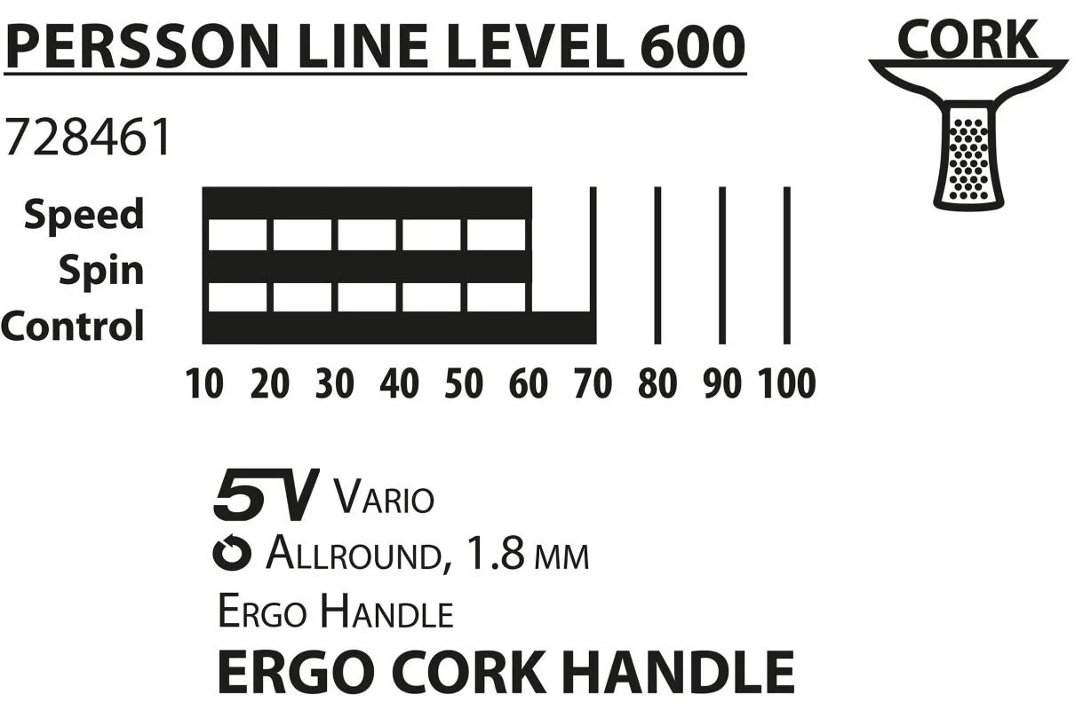 Der „Persson 600“ Tischtennisschläger von Donic-Schildkröt eignet sich für den Freizeitgebrauch und den Schulsport, vom Einsteiger bis hin zum engagierten Hobbyspieler. Gute Holz- und Griffqualität, der Schläger ist zudem mit dem ITTF-zugelassenen hochwertigen Schildkröt Prestige-Belag ausgestattet, der eine gute Übertragung der verschiedenen Spieltechniken auf den Ball ermöglicht. Der zwischen Belag und Holz befindliche 1,8 mm starke Schwamm erzielt eine sehr gute Ballkontrolle und viel Power. Das Material des Griffes besteht aus Kork, was aufgrund seiner hohen Elastizität ein angenehmes Griffgefühl vermittelt und durch seine natürlichen Eigenschaften eine sehr gute Schweißabsorption erzielt und somit auch bei tendenziell schwitzigen Händen eine sichere Schlägerführung gewährleistet. Der ERGO-Griff mit abgerundetem, fließendem Übergang vom Griff zum Schlägerblatt liegt deutlich besser in der Hand als klassische Schläger und vermeidet Druckstellen am Zeigefinger. Diese im Wettkampfsport etablierte Technologie erhält hiermit Einzug in den Bereich der Freizeit-Komplettschläger und ermöglicht zudem schnellstmögliches Umgreifen von Vor- auf Rückhand (und umgekehrt), ein klarer Pluspunkt bei schnellen Tischtennis-Duellen.