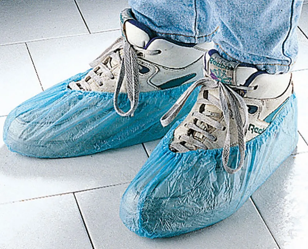 Einweg-Schuhhüllen, 100 Stück in der Farbe Blau, aus umweltfreundlicher Polyethylenfolie mit Gummizug in Standardgröße. Ideal für Bäder und Sporthallen um den Fußboden zu schonen und Verschmutzungen vorzubeugen.