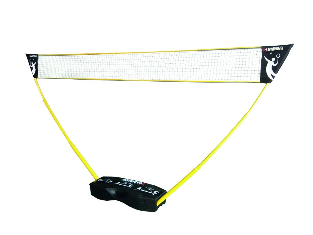 Mobiles Netz für 3 Sportarten in einem praktischen Transportkoffer zum Mitnehmen. Das Hammer 3 in 1 Freizeit-Netz ist ideal für den Strand, den Garten, den Pausenhof oder auch die Sporthalle geeignet. Die Teleskop-Netzpfosten können je nach Wunsch und in Sekundenschnelle auf die Höhe von einem Volleyballnetz (2,24 m Höhe), einem Badmintonnetz (1,55 m Höhe) oder einem Tennisnetz (1,02 m Höhe) eingestellt werden. Der Tragekoffer, der zugleich auch der Netzständerist, läst sich leicht transportieren und verstaut das Set innerhalb von kurzer Zeit. Aufgrund der elastischen Netzpfosten ist jederzeit eine gute Netzspannung garantiert. Im Set sind 3 u-förmige Bodennägel enthalten, welche zur zusätzlichen Bodenverankerung des Pfostenständers (Koffers) dienen.