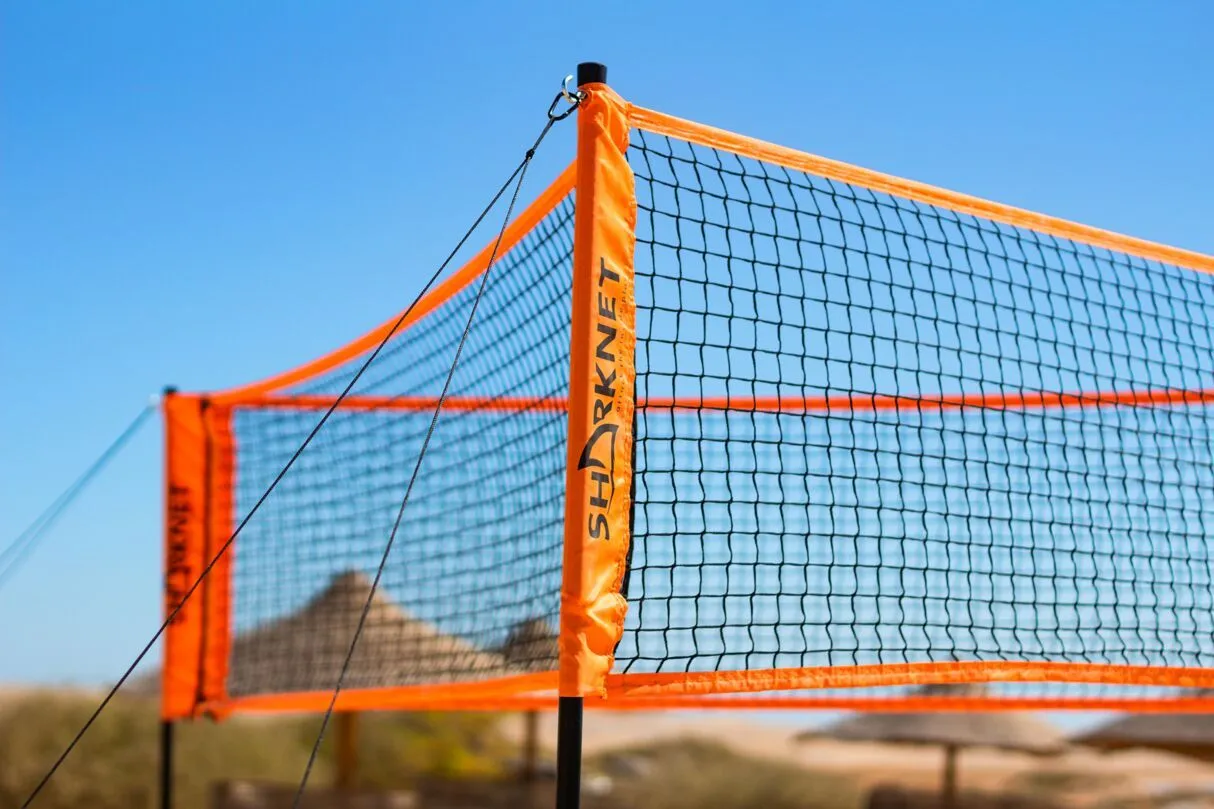Volleyball in Dreiecksform. SHARKNET ist einfach und schnell aufzubauen und eignet sich für alle weichen Untergründe, wie z. B. Sand oder Rasen. Das Netz kann in verschiedenen Höhen aufgebaut werden und wird durch Spannschnüre und Bodenanker sicher befestigt.