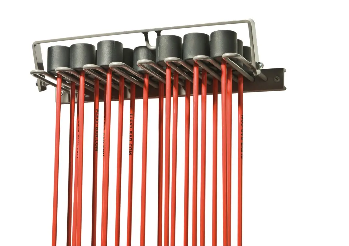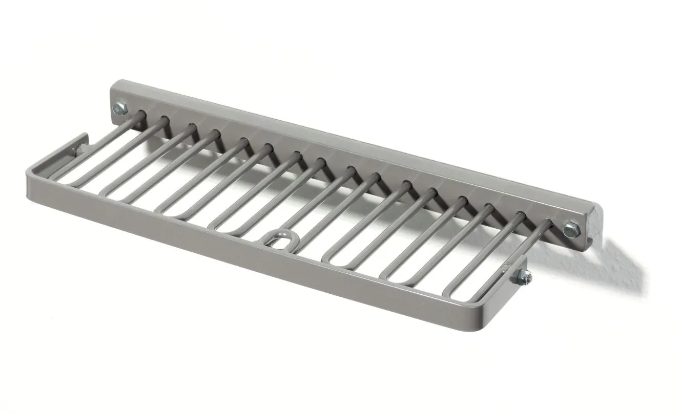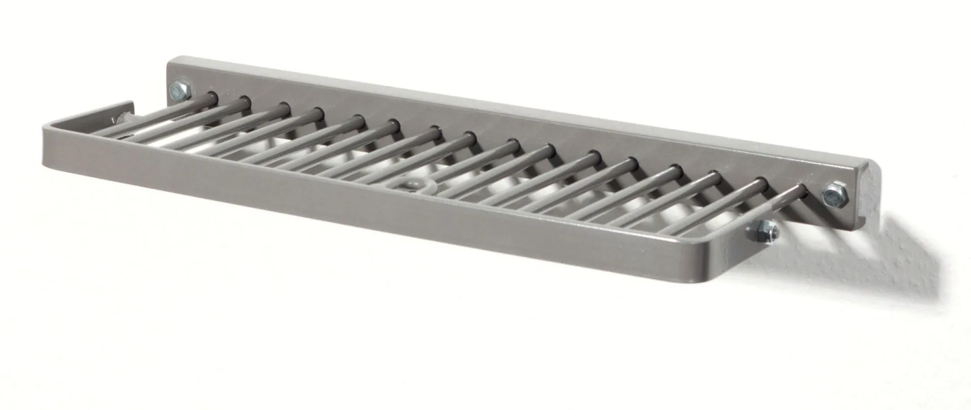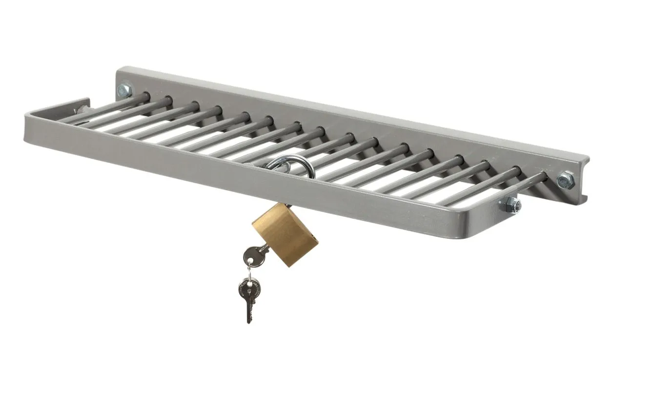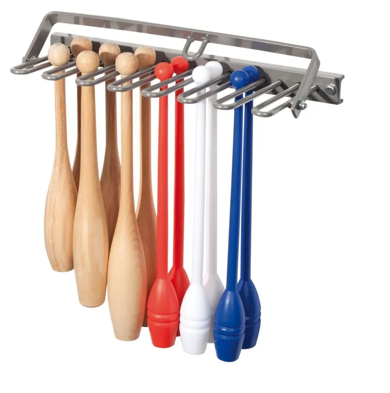 Aufhängevorrichtung eignet sich zur optimalen Aufbewahrung von 28 Holz-oder 35 Kunststoffkeulen oder auch 20 Schwingstäben. So sind die Sportgeräte ordentlich und sicher vor unerwünschter Benutzung untergebracht. Mit Hilfe des klappbaren Bügels und einem Vorhängeschloss kann die Aufhängevorrichtung diebstahlsicher verschlossen werden. Stabile Metallkonstruktion zur Wandbefestigung.