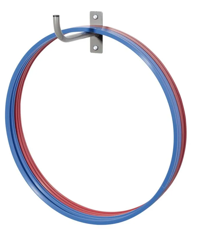 Aufhängevorrichtung für Gymnastikreifen zur Wandbefestigung. Geeignet für die platzsparende Aufbewahrung von über 20 Reifen.
