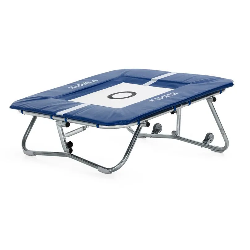 Angepasst an Turngeräte in Schulen und Vereinen. Das Trampolin ist sowohl vorne als auch hinten höhenverstellbar und es kann in waagrechter Stellung genutzt werden. Die Umrandung ist aus abwaschbarem PVC gefertigt und mit einer Markierung zur besseren Orientierung versehen. Dank der praktischen angebauten Rollen kann es gut transportiert werden.
