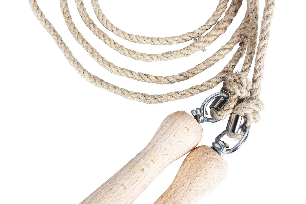 Das Springseil besteht aus 100% Hanf mit Holzgriffen und Drehwirbel. Das Seil ist in der Mitte auf 1 cm verstärkt, die Seillänge ist verstellbar. Die Holzgriffe sind naturfarben und lackiert.