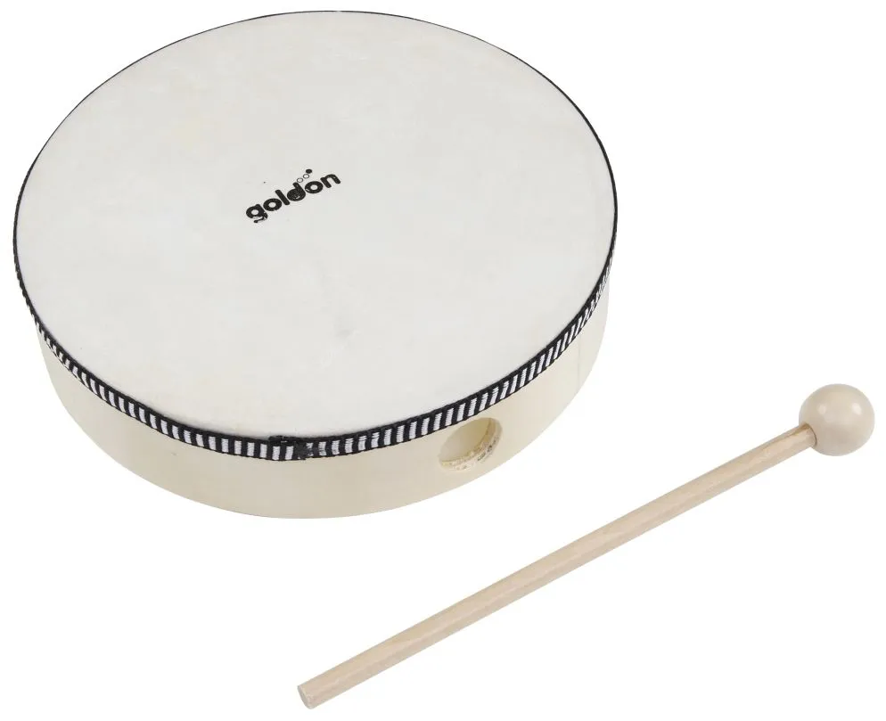 Tamburin hat einen Korpus aus Holz und einen Naturfellbezug. Ein Schlägel ist enthalten. Das Tamburin ist zwei verschiedenen Größen erhältlich.
