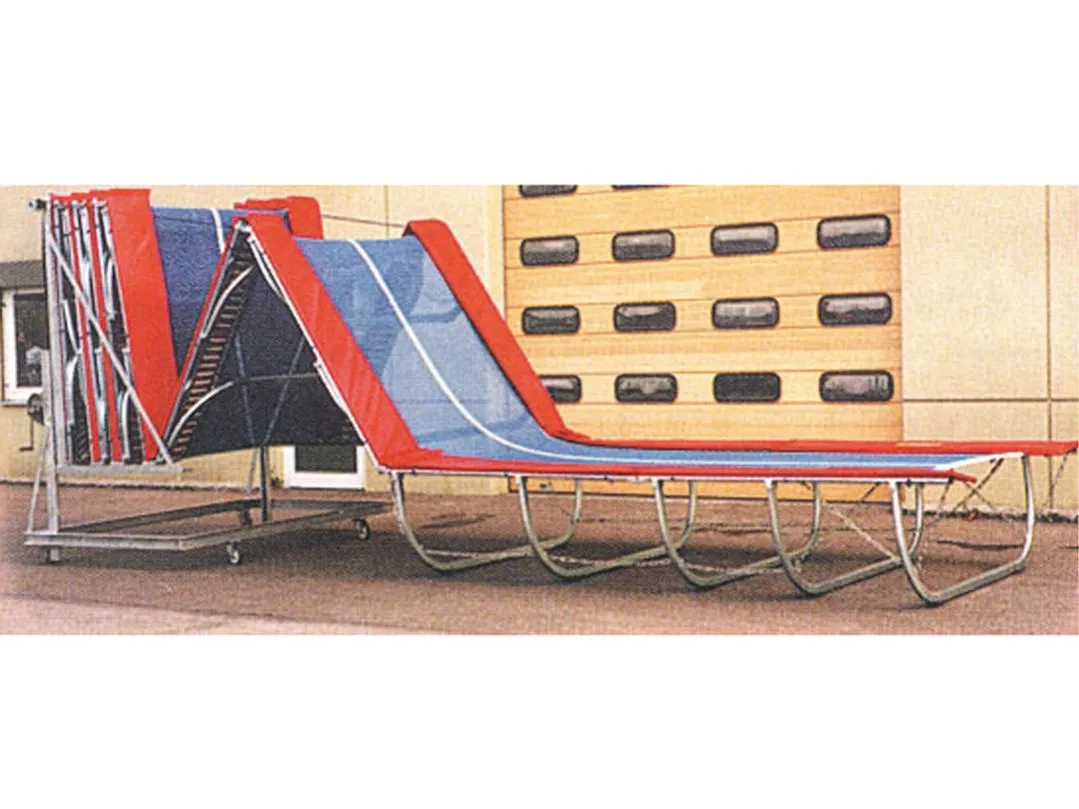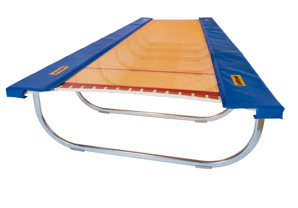 Für das Tumbling-Training, der 3. Disziplin des Internationalen Trampolinverbandes. Die Elastizität des Sprungtuches erlaubt auch ein verletzungsfreies Einüben und Erlernen von Bodenturnübungsteilen. Rahmen aus galvanisch verzinktem Spezial-Stahlrohr, in 2-Meter-Segmenten. 200 cm breit, 72 cm hoch, Sprungtuch aus Kunststoffgewebe 140 cm breit. Länge des Sprungtuchs und der Ganzabdeckung entsprechend der gewünschten Rahmenlänge, 66 Stahlfedern je 2-Meter-Segment. Rahmenpolster 24mm, inkl. Fußpolster.